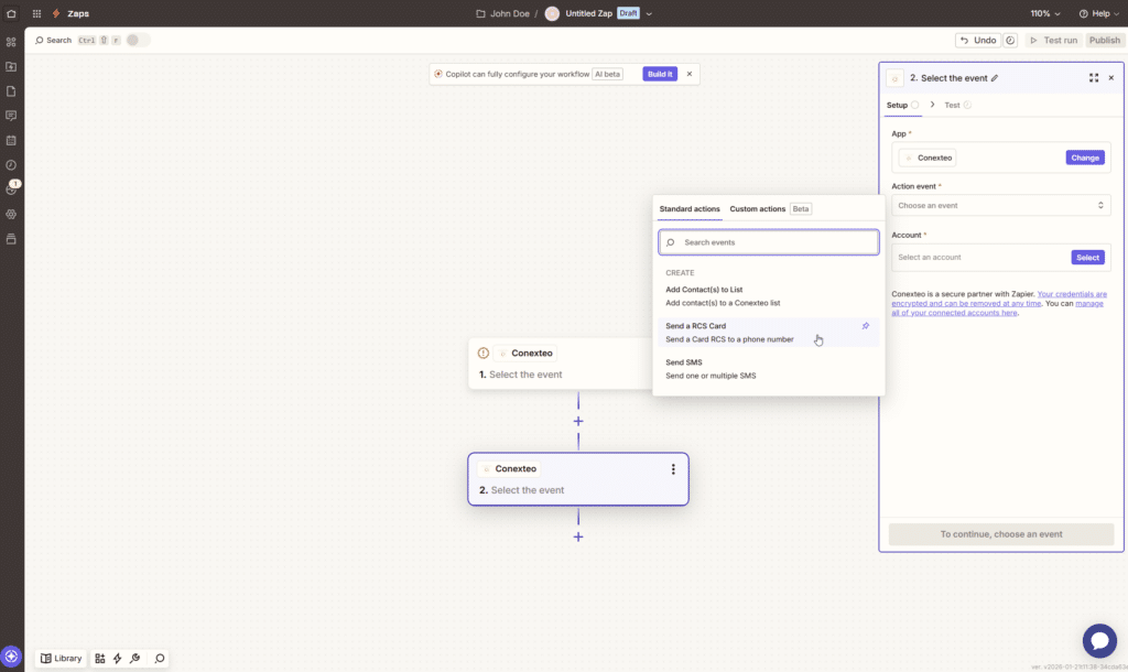 - Événement : « Send SMS » (ou « Send RCS » si vous voulez envoyer un message enrichi)